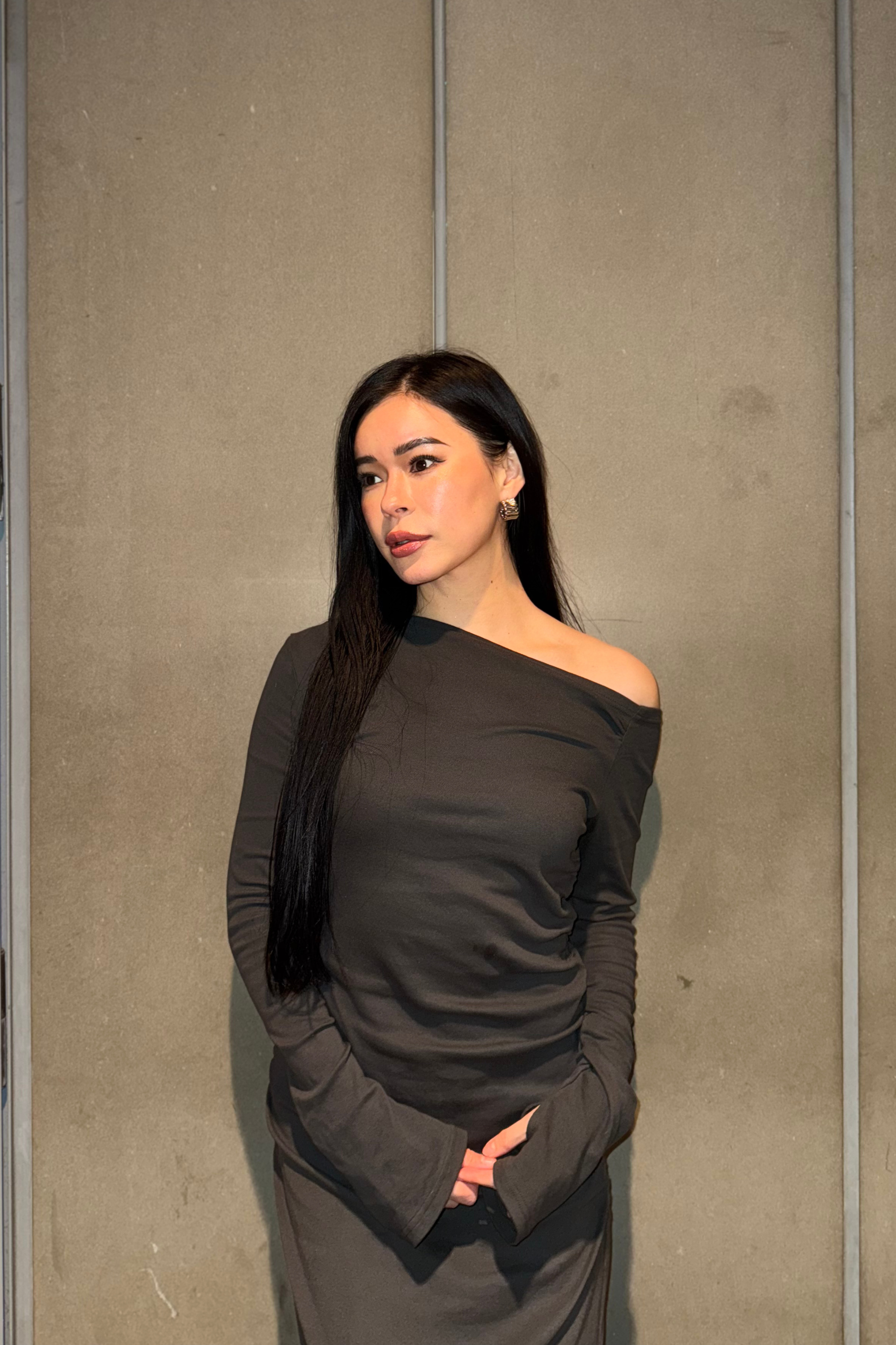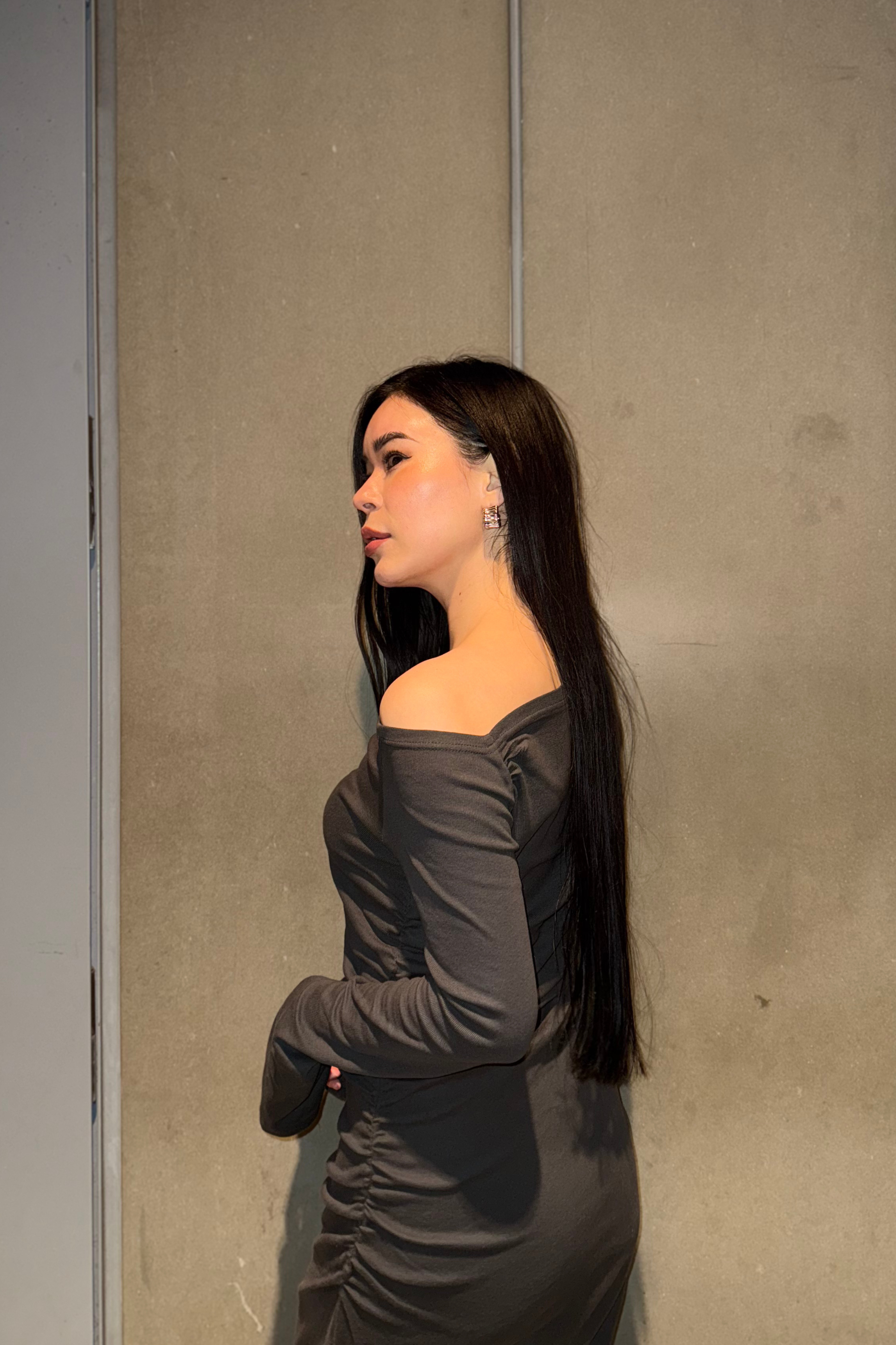 去年完売のワンピースが再販決定。新色にチャコールグレーが入荷しました。国産素材を使用し、国内で生産された日本製ワンショルダーワンピース。伸縮性に優れたコットン素材のモダール生地を使用し、美しいBODYラインを演出。腰回りと腕に複数のギャザー。袖口にはフィンガーホール付いており寒い時期でも指が出せるデザイン。REVIRAL‘で一推しの即完ワンピースです。