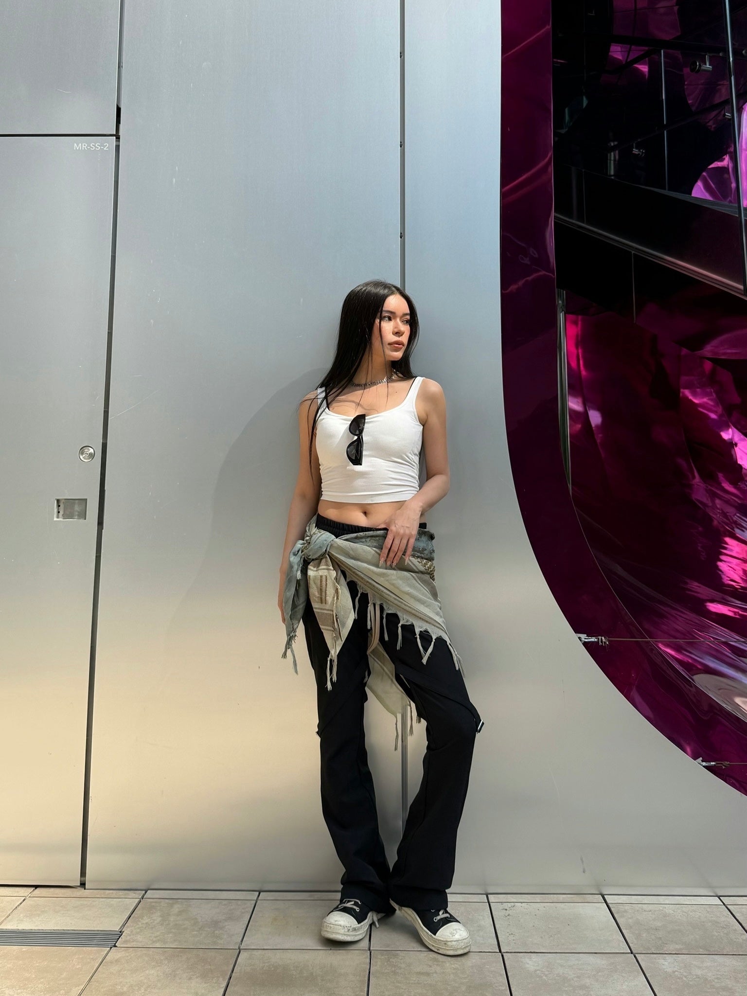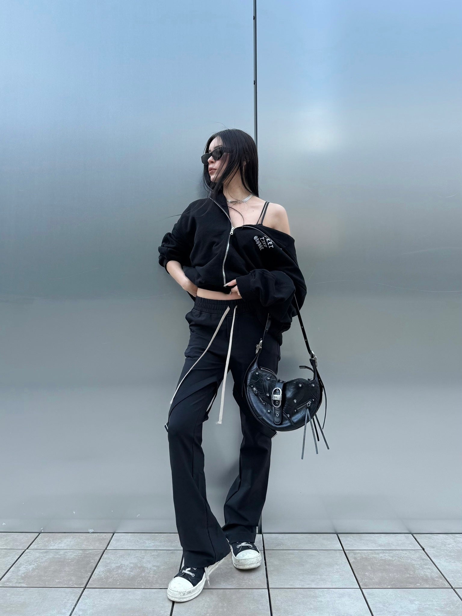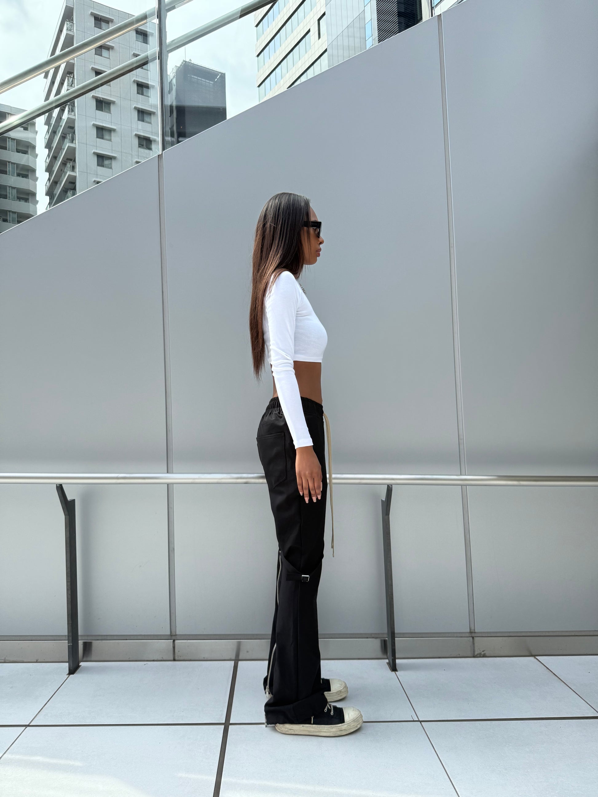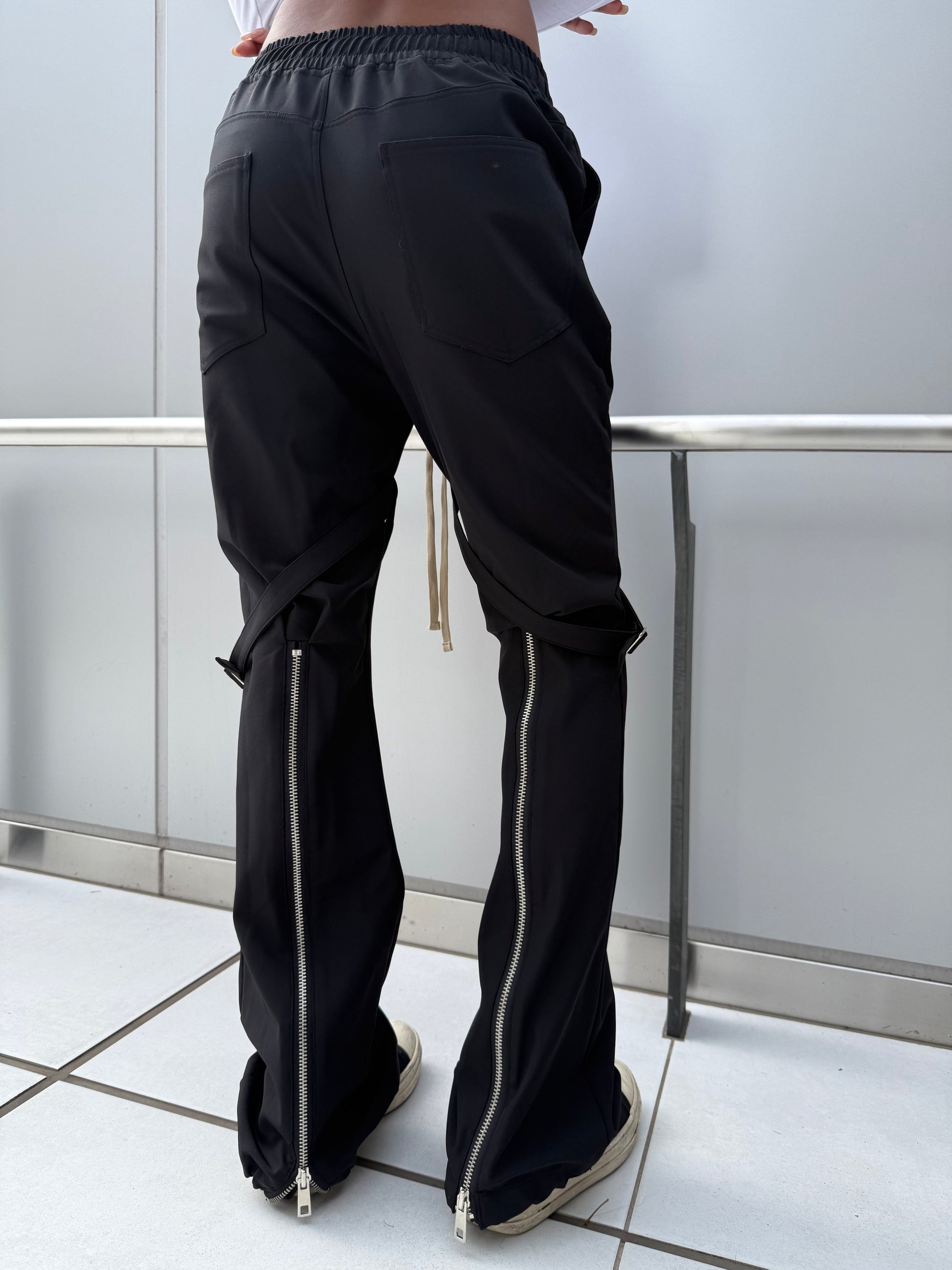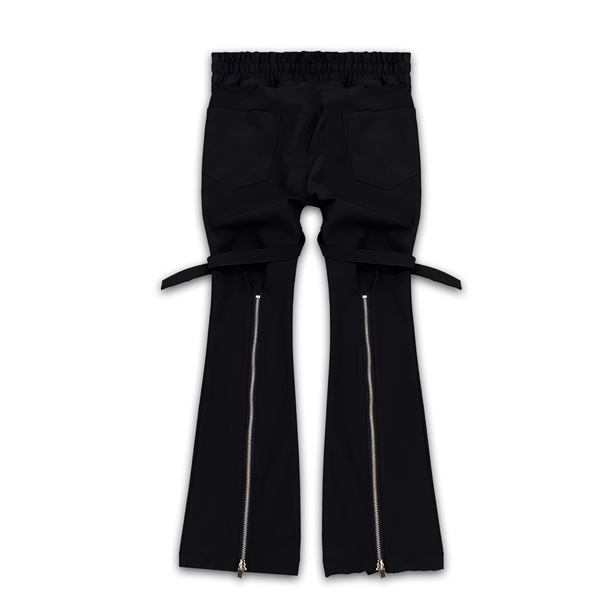 大胆に広がるフレアラインが描く、美脚シルエットパンツ。太ももに配したベルトが緩急を生み出し、膝下からの自然な広がりが脚を長く、細く魅せる設計。裾にはアジャスターを内蔵し、たまりの調整が可能。引きずらない丈感をキープしながら、低身長でも美しく穿きこなせる。バックスタイルにはMA-1と同仕様のジップディテールを施し、視線を惹きつけるアクセントに。一見シンプルでありながら、穿いた瞬間にその完成されたシルエットの良さが実感できる、REVIRAL’らしい力強くも洗練された一本。