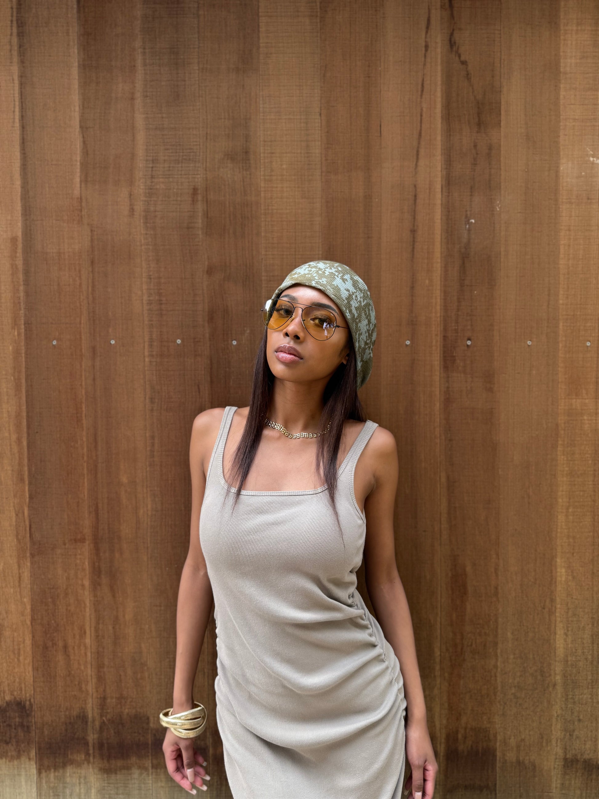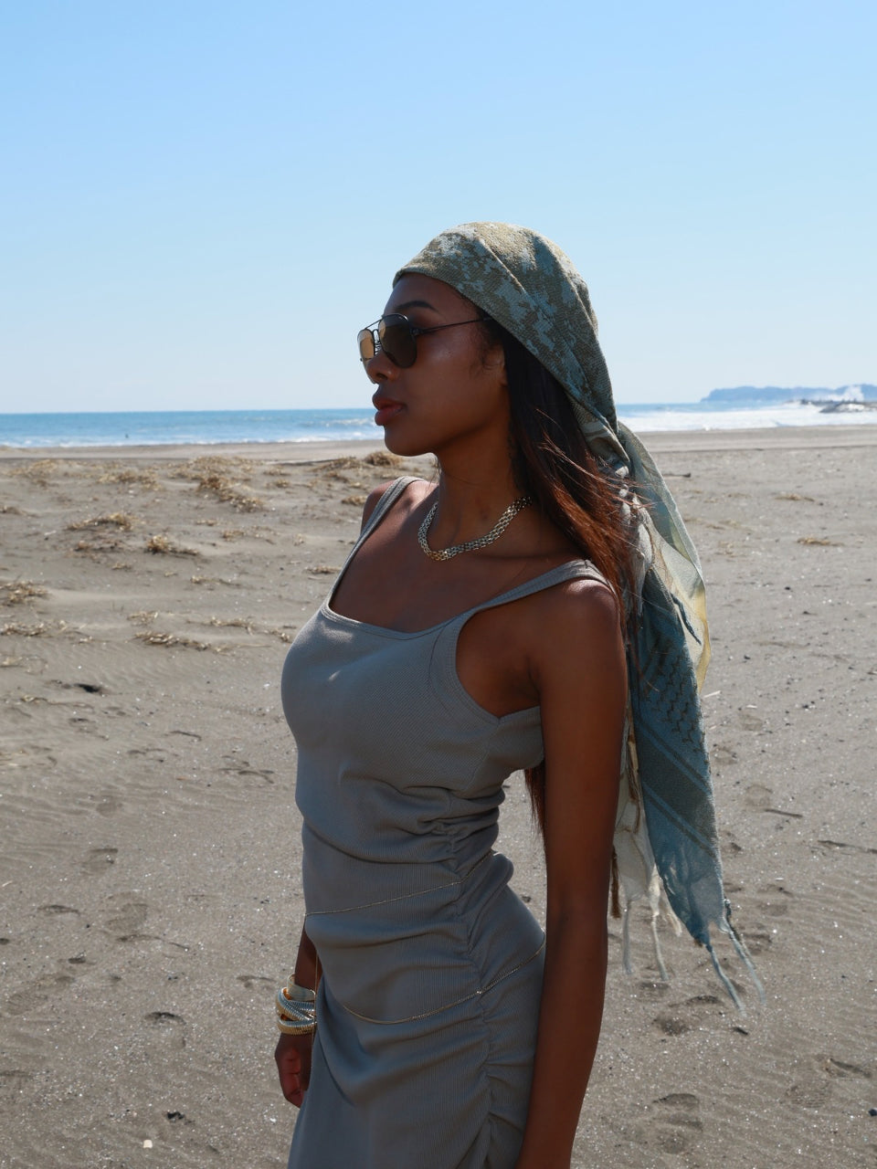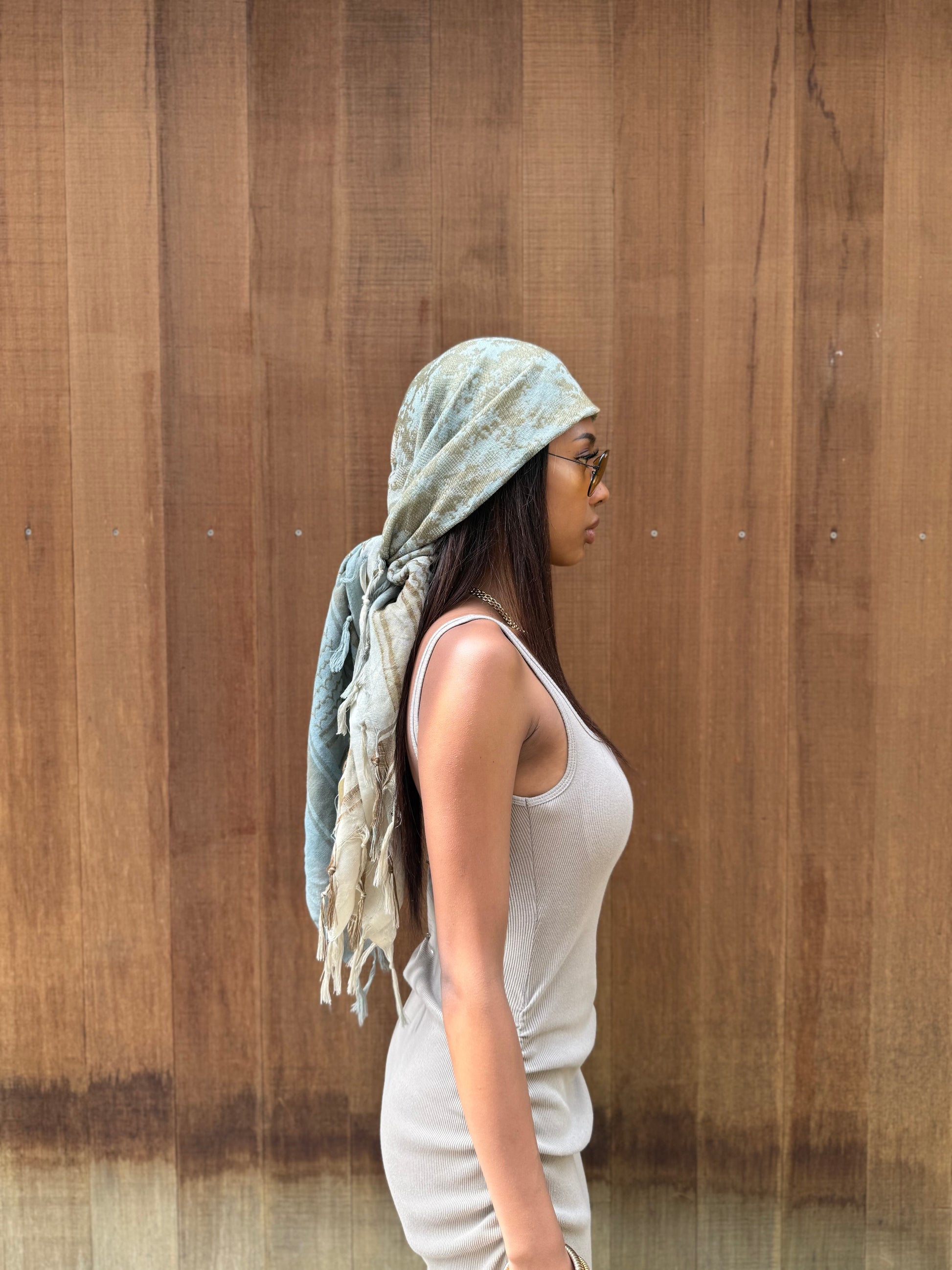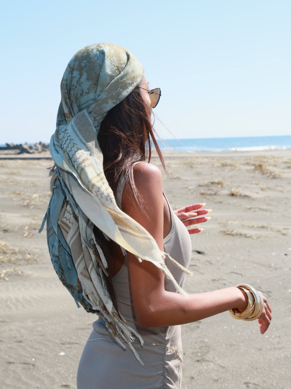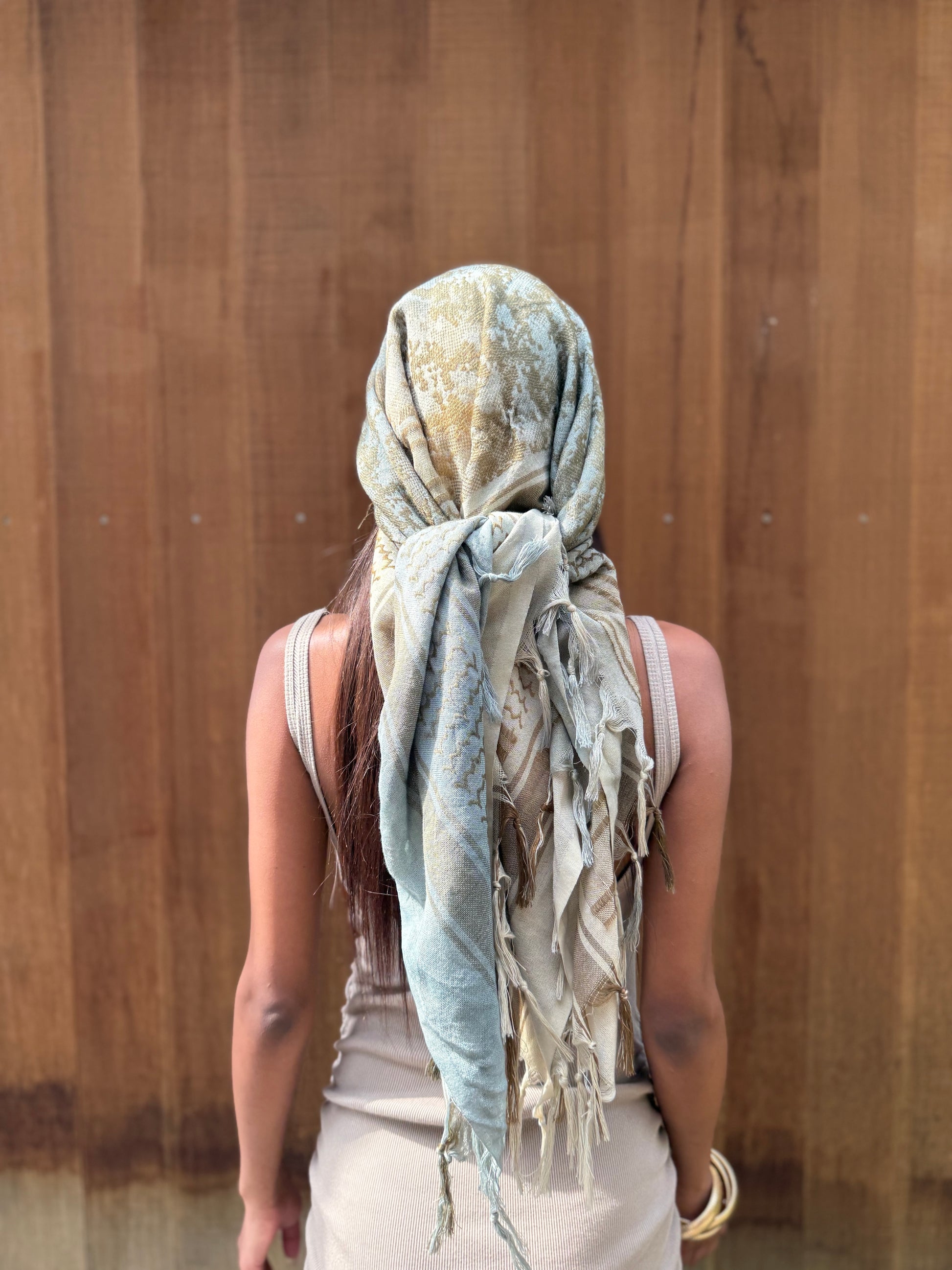 カーキとベージュを職人が一点ずつ染め上げた、ヴィンテージのグラデーションカラーのハンドメイドシュマグ。繊細なカモ柄と柔らかな風合いを醸し出さす。ゆったり巻くことにより、程よいボリューム感がでて後ろから見てもオシャレな印象に。首元にラフに巻いたり、頭に巻いてアクセントにしたり、ユニセックスで自由に楽しめる一枚。