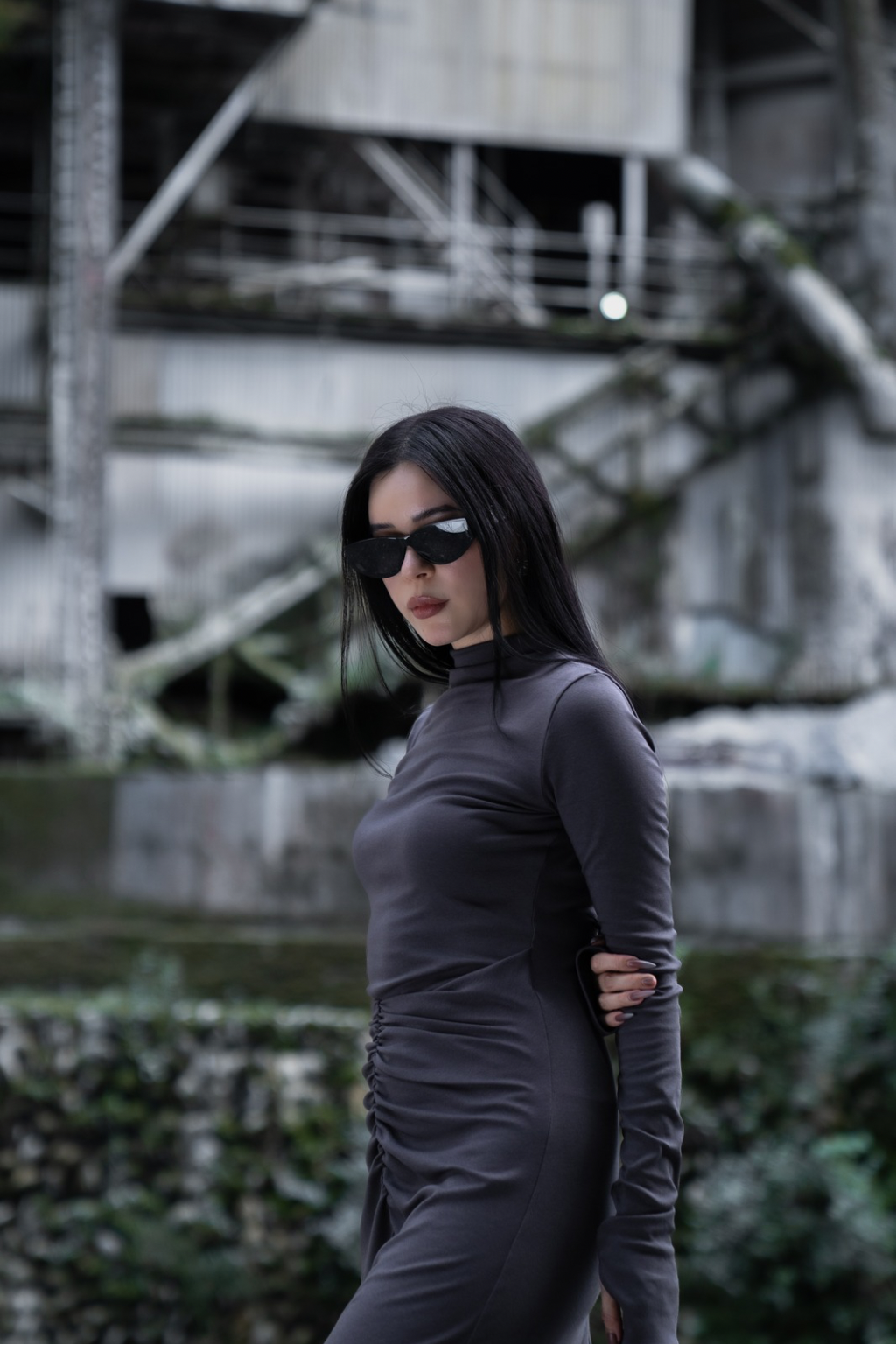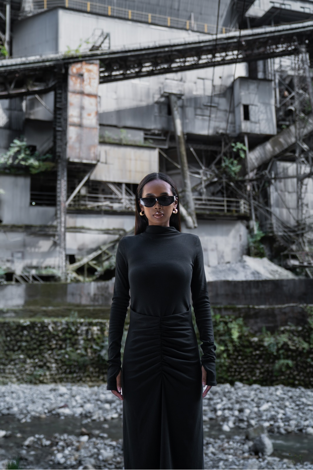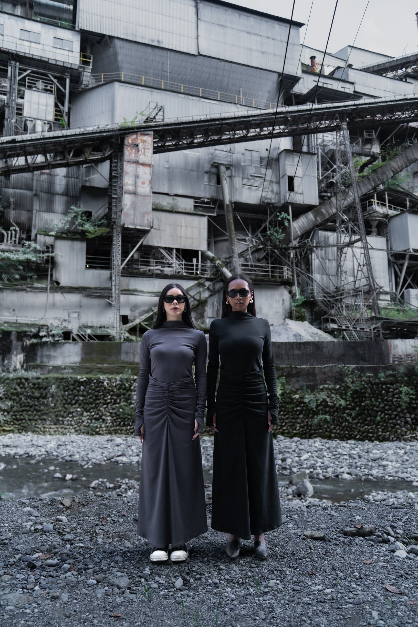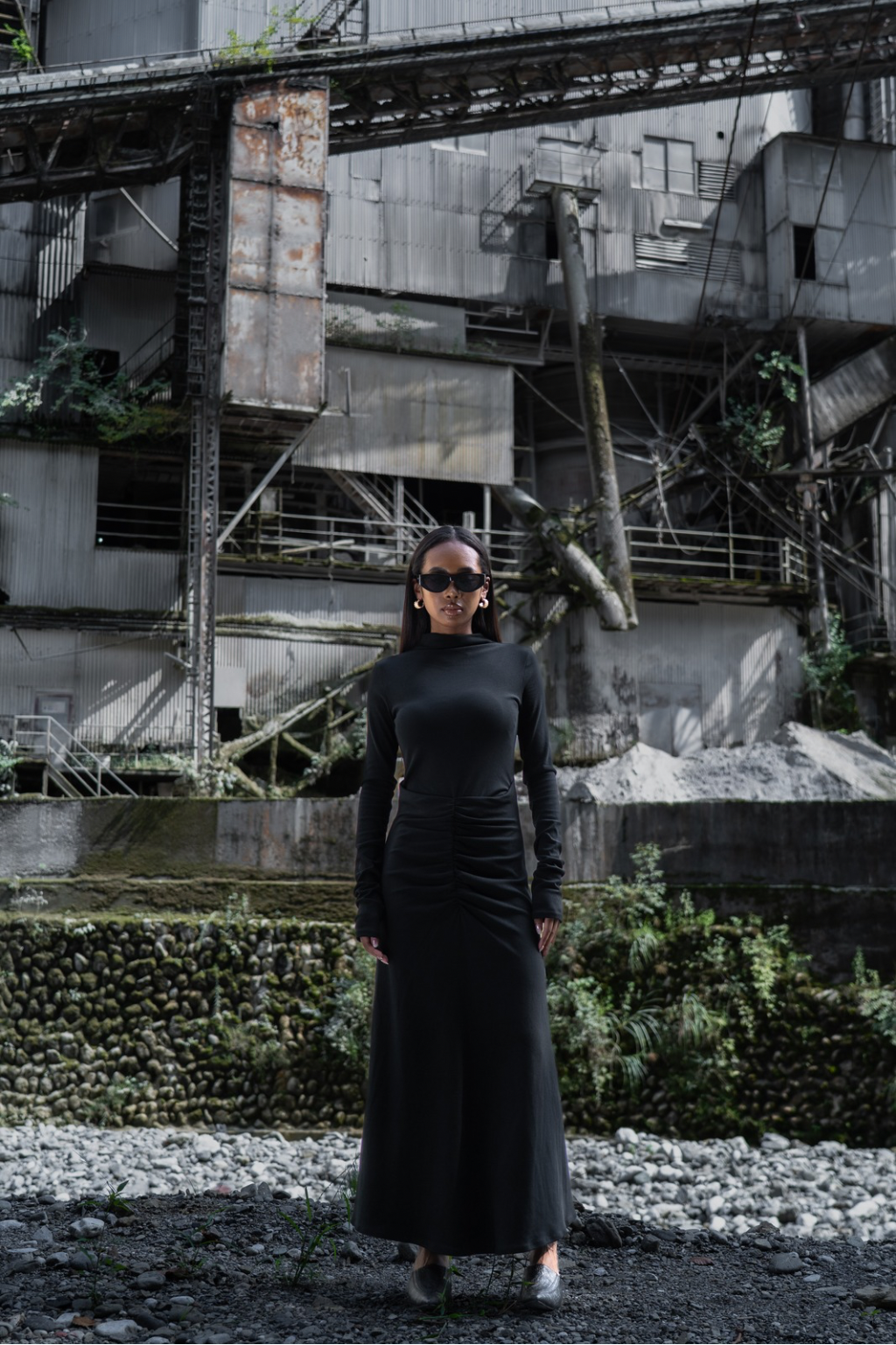 美しい身体のラインを描くように計算されたサイドドレープが特徴のロングドレス。お腹周りをカバーしつつ、フロントに動きを出すタックデザインでセクシーと安心感を両立。厚みと柔らかさのある日本製ストレッチ素材で、長時間の着用でもストレスフリー。親指スリット入りの袖やプチハイネックなど、オケージョンにも日常にも使える万能ワンピース。