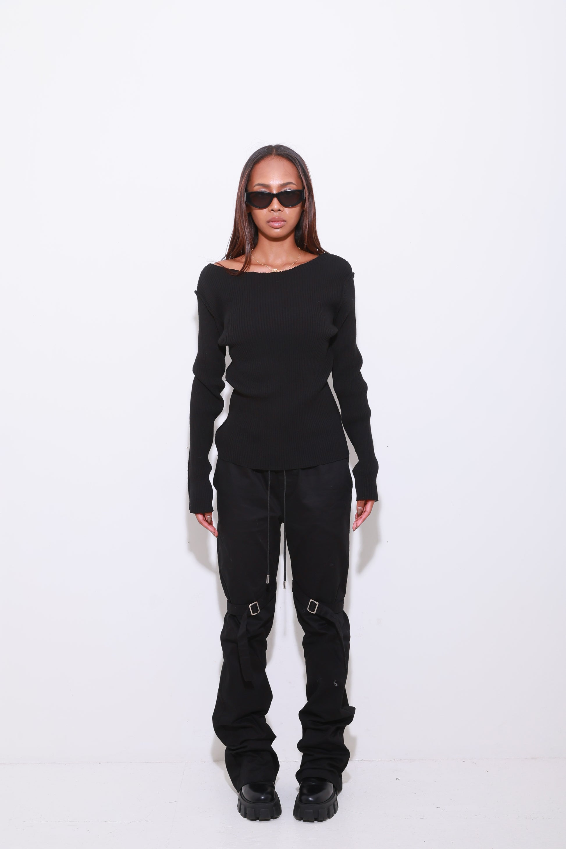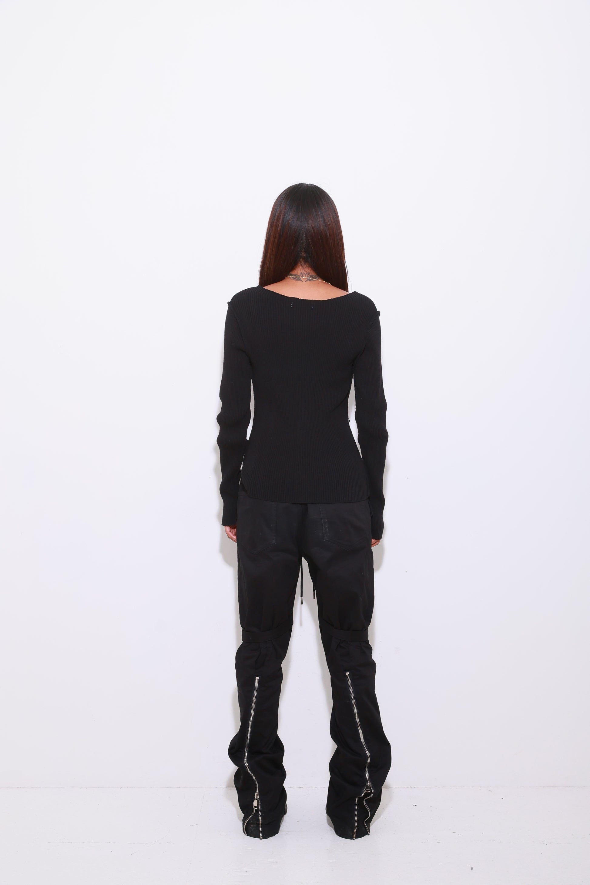 上品なタイト過ぎないBODYラインと伸縮性を兼ね備えた1枚。長めの袖感が流行りのY2Kシルエットに。表に出たステッチのティールが1枚でもアクセントになります。広めのボートネックが首回りを綺麗に見せてくれます。